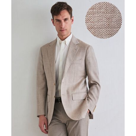 ウール・シルク・リネンを贅沢にブレンドしたヘリンボーン生地で、240gの軽量感と上質な清涼感を両立。リネンの涼やかさとシルクの上品な艶、そしてベージュ特有の柔らかな明るさが、夏の装いにエレガンスを添えます。