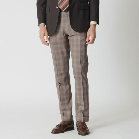 珍しいブラウングレナカートチェックのスラックスはやや細番手の80番双糸使いは繊細な組織感とタッチ感が特徴のスラックス生地。