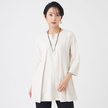長いシーズン活躍するチュニックカットソー。フィット&フレアを意識したシルエットで、程よい広がりとウエストラインのシェイプによりスタイルアップが叶うデザインです。しなやかな落ち感と冷感のあるタッチを、新しいシルエットで楽しめる一枚に仕上げています。