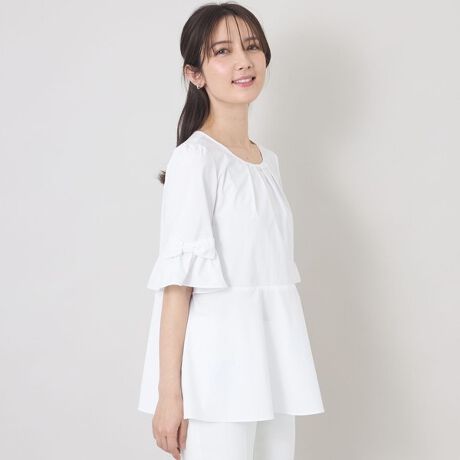 襟元にガラスビジュー刺しゅうを施し、袖口にボリュームを持たせて程よい甘さをプラスした、フレア切替えのチュニック丈ブラウスです。ロング丈・ショート丈のジレや羽織りと合わせれば、旬のレイヤードスタイルが楽しめます。