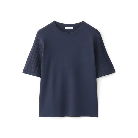 身頃はゴム地編み、袖はタックストライプ柄を組み合わせたコントラストのあるデザインです。タックによるラインが入った襟元が、さりげないアクセントになっています。