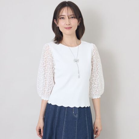 身頃はニット、袖にはレースを使用した異素材ドッキングデザイン。程よい華やかさがあり一枚でスタイリングが完成する、汎用性の高いアイテムです。