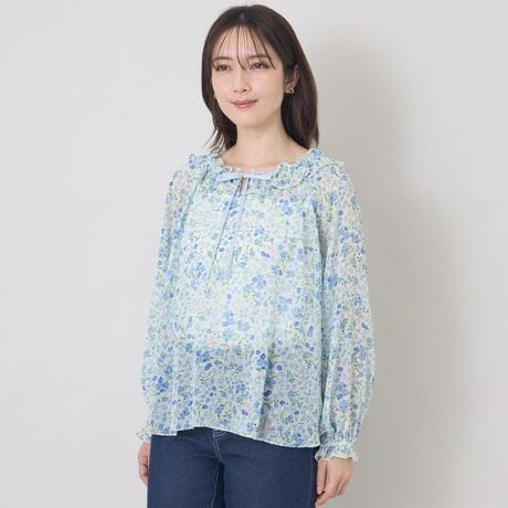 襟元には平ゴムを入れ、共布フリルを寄せた華やかなデザイン。胸元の配色サテンリボンがアクセントとなり、顔周りを明るく印象的に演出します。袖口にも平ゴムを施しているため、袖丈の調整がしやすく、着心地も快適。スカートにもパンツにも合わせやすく、着回し力の高い一枚です。