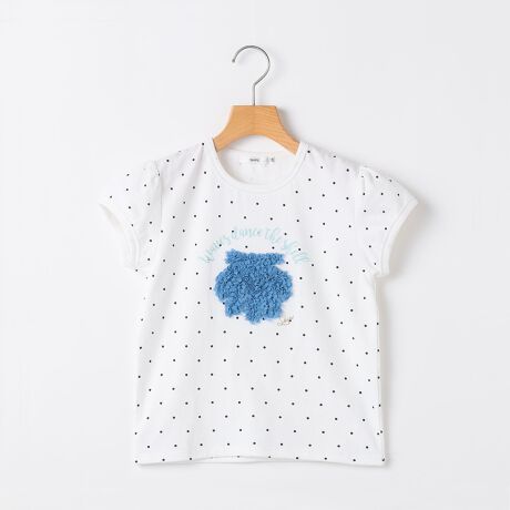 アイボリー・・ ドット柄のボディにフロントにはふわふわと立体感のあるシェル刺繍