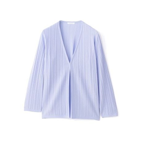 全面タックストライプ柄の着流しカーディガン。着丈に前後差のついた、裾スリットあきのデザインです。