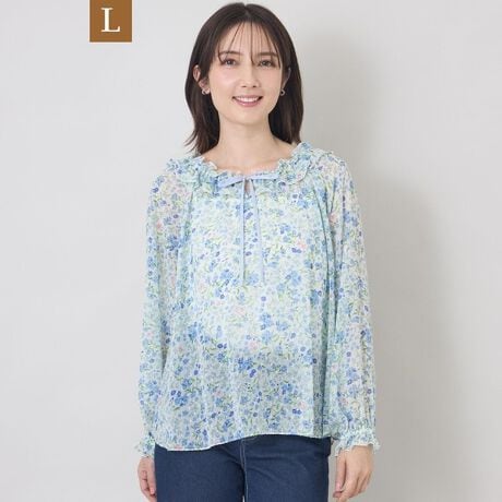 襟元には平ゴムを入れ、共布フリルを寄せた華やかなデザイン。胸元の配色サテンリボンがアクセントとなり、顔周りを明るく印象的に演出します。袖口にも平ゴムを施しているため、袖丈の調整がしやすく、着心地も快適。スカートにもパンツにも合わせやすく、着回し力の高い一枚です。