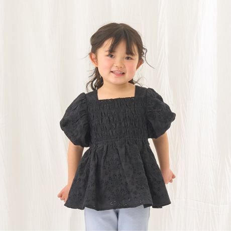 ・コットンのアイレットレースを使用したパフスリーブシャーリングブラウス