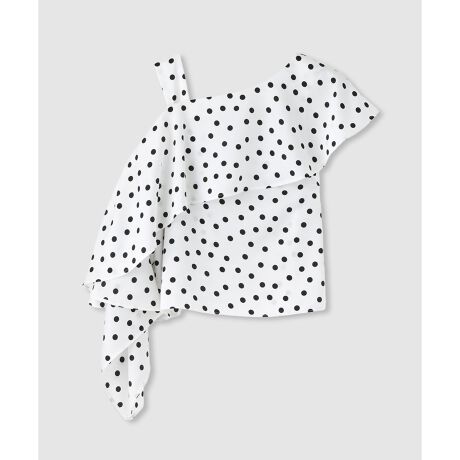 光沢の美しいサテンを使用。落ち感が良く、さらりとした肌触りです。無地のシロとドット柄の3色展開になります。アシンメトリーなデザインで、片方のみに大胆なラッフルフリルがついています。フリル先には小さいスナップで手を通すことが可能です。反対の肩のストラップは取り外し可能です。程よい肌見せで大人っぽく着こなして頂けます。