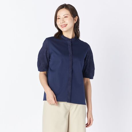 肌にさらっと心地よく着られるコットン100%素材で仕上げたシャツです。袖と前立て部分にはフラワーモチーフの刺繍をON、身生地と同じカラーにすることで目立ち過ぎないドレスアップがかないます。パフスリーブでシルエットに女性らしさをプラス、かくしボタンのすっきりとしたデザインも魅力です。