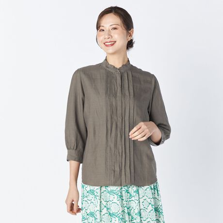 ほど良いハリ感と上品な光沢感をあわせ持つ、ラミー素材で仕上げたシャツです。吸水性や通気性もよく、汗をかいてもすぐに乾いて快適、肌にさらっと心地よく着られます。衿元のフリルと胸元のタックプリーツで大人可愛くおめかし、折り返しても着られる手首がのぞく袖丈でロングシーズン着まわせるのもうれしいポイントです。