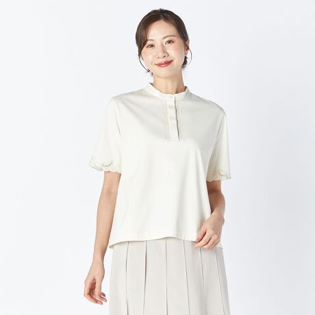 なめらかで優しい肌ざわりが心地よい、コットンスムース素材で仕上げたプルオーバーカットソーです。袖と前立ての両サイドに刺繍をあしらいフェミニンに飾りつけしました。顔まわりをすっきりと見せてくれるバンドカラーもポイント、Tシャツ感覚でラフに着られてきちんときれいめにもあわせられるアイテムです。