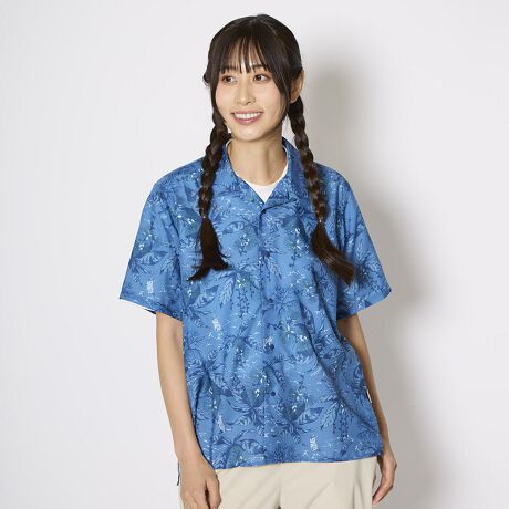[型番:5212632]通気性に優れたポリエステル素材を使用した、やわらかく、サラッとした肌触りの総柄半袖シャツ。カジュアルに着こなせるオープンカラー&ドットボタン仕様です。西表島の動植物をモチーフにした、南国の雰囲気を感じるオリジナルプリントデザインは、印象的ながらもフィールドに溶け込みます。ゆったりシルエットのコンフォートフィットデザイン。