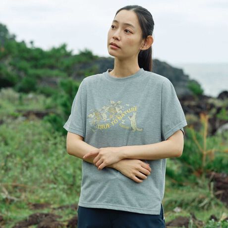 [型番:8215679]西表島を代表する動植物であるサガリバナとイリオモテヤマネコをイラストで表現したTシャツ。特殊セラミック繊維による遮熱効果で衣服内温度-3℃を実現した「コカゲシールド」素材は、紫外線を遮断することにより、淡色でも高いUV遮蔽率を発揮します。速乾性に優れたドライな着心地は盛夏に最適です。ゆったりシルエットのコンフォートフィットデザイン。