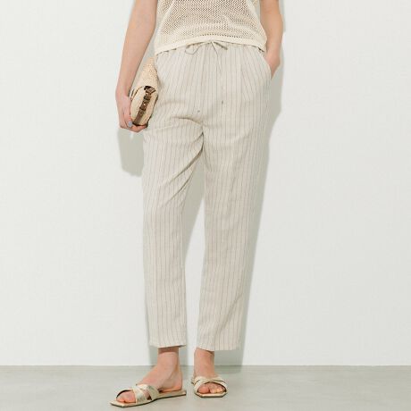 細めのストライプ柄が縦ラインを強調し、脚をすっきりと見せてくれるテーパードパンツ。
