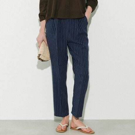 細めのストライプ柄が縦ラインを強調し、脚をすっきりと見せてくれるテーパードパンツ。