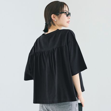 後ろ姿にさりげないポイント、バックギャザーTシャツ