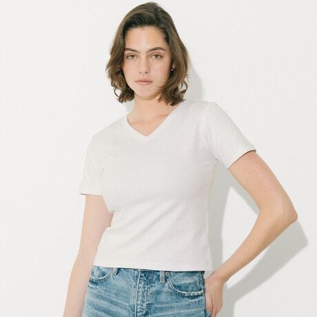 顔まわりをすっきり見せてくれるVネックデザインの半袖トップス。