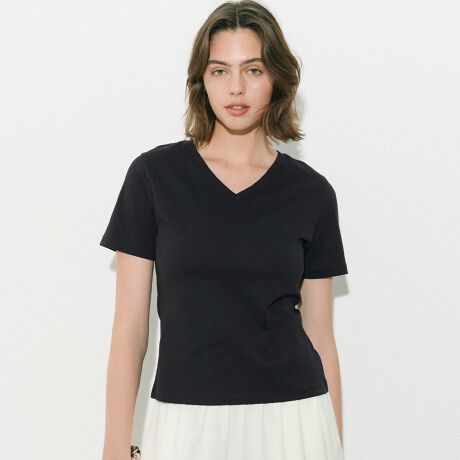 顔まわりをすっきり見せてくれるVネックデザインの半袖トップス。