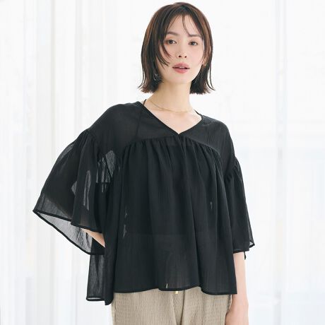 ふんわりと広がるフレアスリーブが印象的なシアーブラウス。
