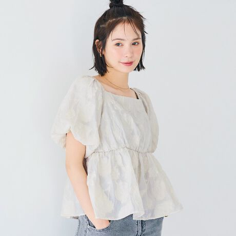 立体感のあるフラワージャカード素材が目を引くブラウス。