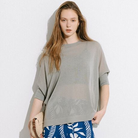 ゆったりとしたドルマンスリーブが特徴のシアーニットトップス。