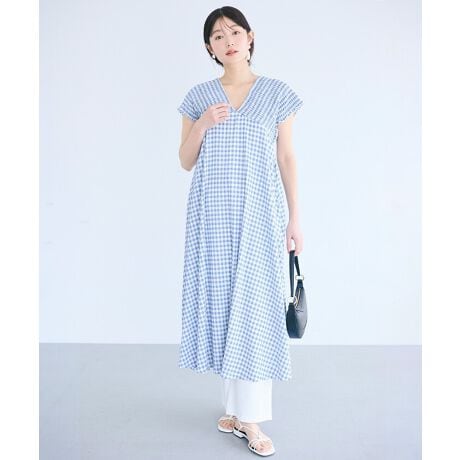 肩部分に施されたシャーリングデザインが目を惹くVネックワンピース。