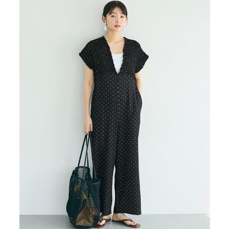 シボ感のある素材とシャーリングデザインが特徴のオールインワン。