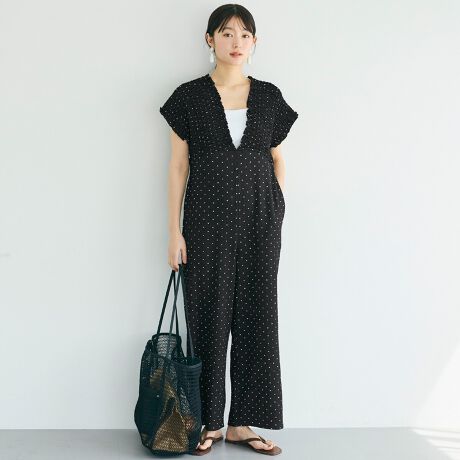 シボ感のある素材とシャーリングデザインが特徴のオールインワン。