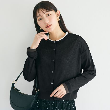 シアー素材を重ねたレイヤードデザインが特徴のカーディガン。
