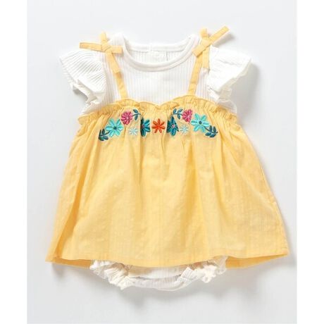 [型番:V233936]apres les cours(アプレレクール)のカバーオール・ロンパース「花刺繍キャミドッキングロンパス」は、やさしいニュアンスのナチュラルなデザイン。ベビーギフトや出産祝いの主役にも♪#apreslescours【サイズ情報】70:身丈39.5 身幅26 肩幅20 腰幅36.4 足口幅10.580:身丈41.5 身幅27 肩幅21 腰幅37.7 足口幅11