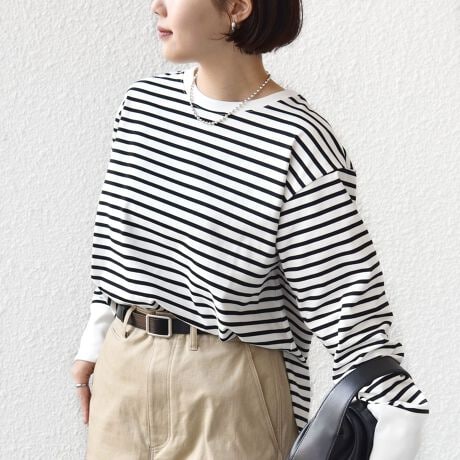 少し長めの丈でレイヤードスタイルにも使える万能アイテムです。