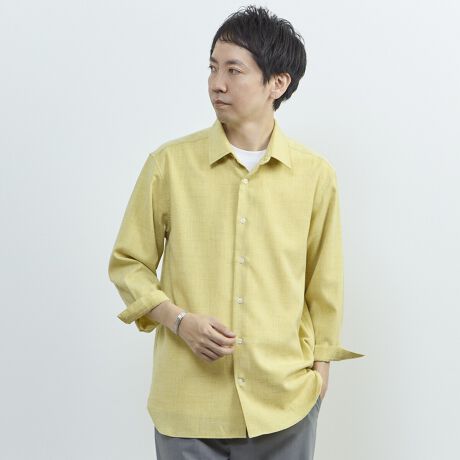 リネンライクなポリエステル素材を使用したスタンダードなレギュラーカラー8分袖シャツです。