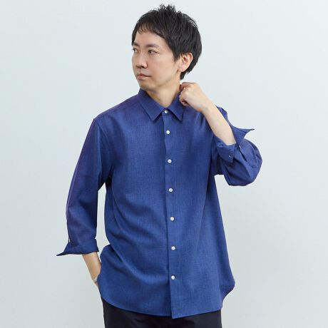 リネンライクなポリエステル素材を使用したスタンダードなレギュラーカラー8分袖シャツです。