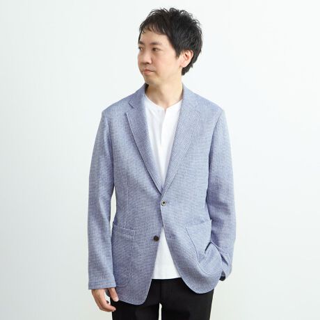 ディテールを省いたシンプルなテーラードスタイルながら、DRYタッチな素材感がきちんと感を演出。