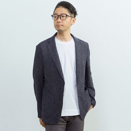ディテールを省いたシンプルなテーラードスタイルながら、DRYタッチな素材感がきちんと感を演出。