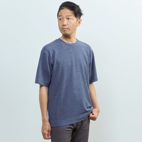 杢糸が生み出す複雑な表情と、リンクスジャガード特有のニットライクな質感が融合した半袖Tシャツです。