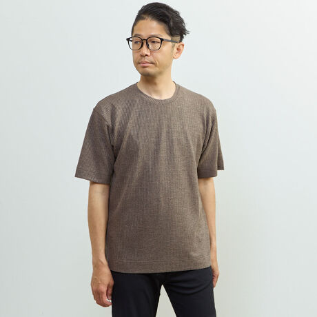 杢糸が生み出す複雑な表情と、リンクスジャガード特有のニットライクな質感が融合した半袖Tシャツです。