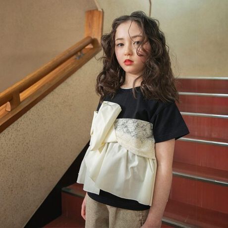 シンプルなOu?のボトムスと合わせるだけで、ぐっと華やかなスタイリングが完成!