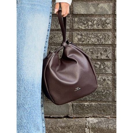 </div><div>シルバーの金具が、シュリンクレザーの質感を引き締め、都会的な印象に仕上げています。</div><div>付属のショルダー紐で、その日の気分や荷物の量に合わせたスタイリングが可能です。</div><div>コンパクトながら、日常の必需品を整理して収納できるサイズ感も魅力。</div><div>