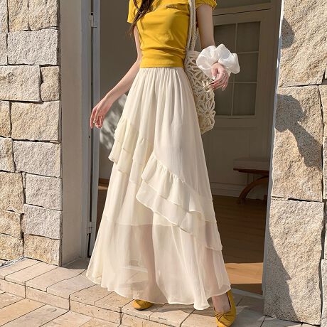透け感のあるシフォン素材を重ねたティアードデザインのロングスカートです。
