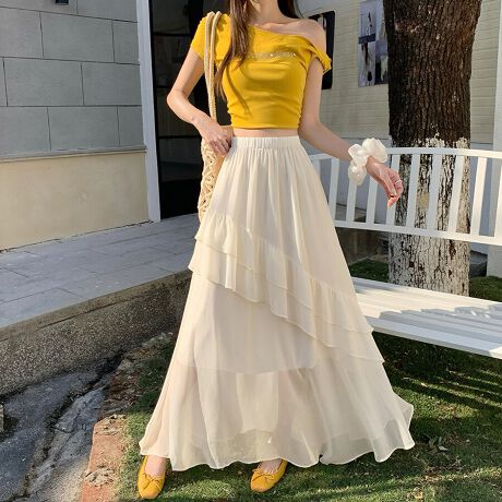 透け感のあるシフォン素材を重ねたティアードデザインのロングスカートです。