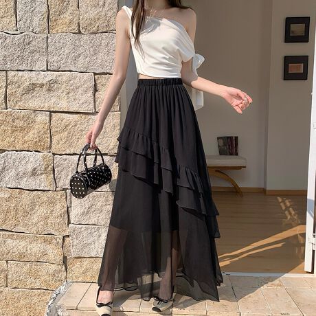 透け感のあるシフォン素材を重ねたティアードデザインのロングスカートです。