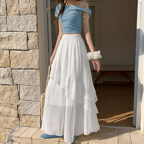 透け感のあるシフォン素材を重ねたティアードデザインのロングスカートです。