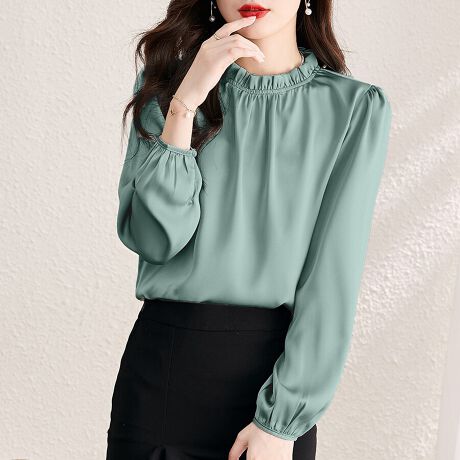 ネックラインから自然に広がるギャザーが柔らかな表情をつくり、女性らしい雰囲気を引き立てます。