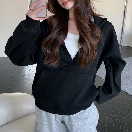 Vネックのデザインが抜け感をつくるフード付きパーカーです。