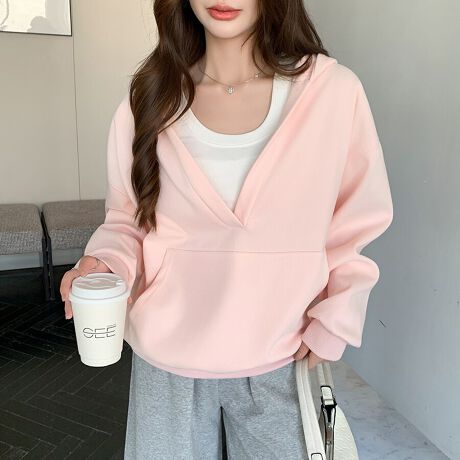Vネックのデザインが抜け感をつくるフード付きパーカーです。