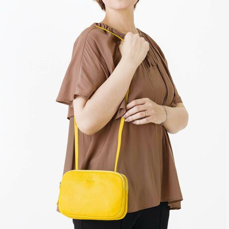 二つのポーチが合体したようなユニークなデザインが目を引く、上質なシープレザーポシェット。