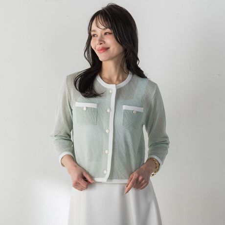 小さなスパンコールが編み込まれた華やかで上品な糸を使い、清涼感のあるメッシュ組織に編み上げたニットカーディガンです。