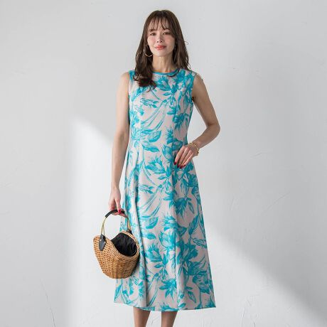 リネンライクな表情のある素材に線画タッチの花を大胆に描いたプリントワンピース。