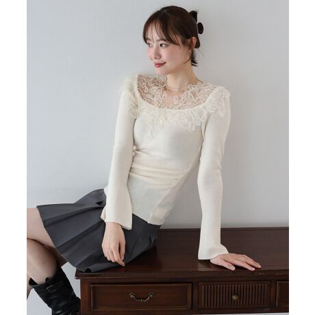 デコルテを彩る大胆なフラワーレースが、大人の華やかさを放つニットトップス。